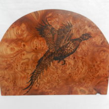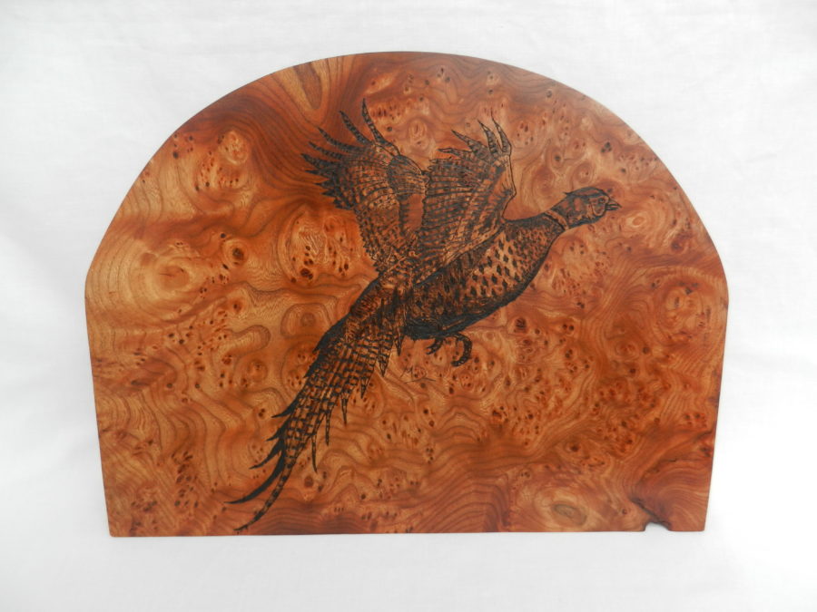 Pheasant pyrography on Burr Wych Elm by Mike Dunn Gallery